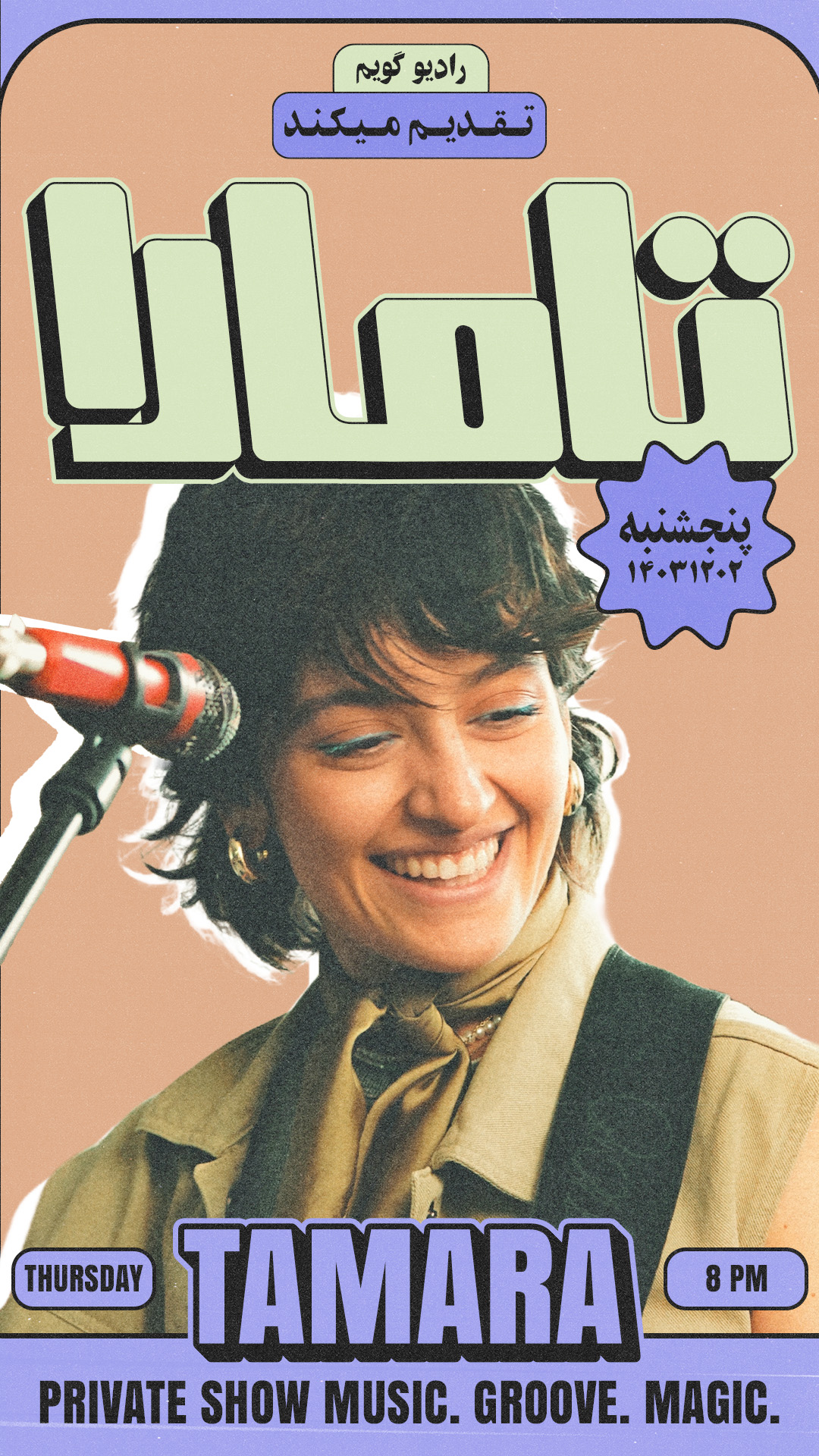This poster was created for Tamara’s live performance in 2024. Featuring a bold color palette and the artist’s own portrait, the design aims to capture the mood and energy of her work. The custom Persian typography adds a unique visual identity, making the poster stand out and resonate with Tamara’s artistic style.