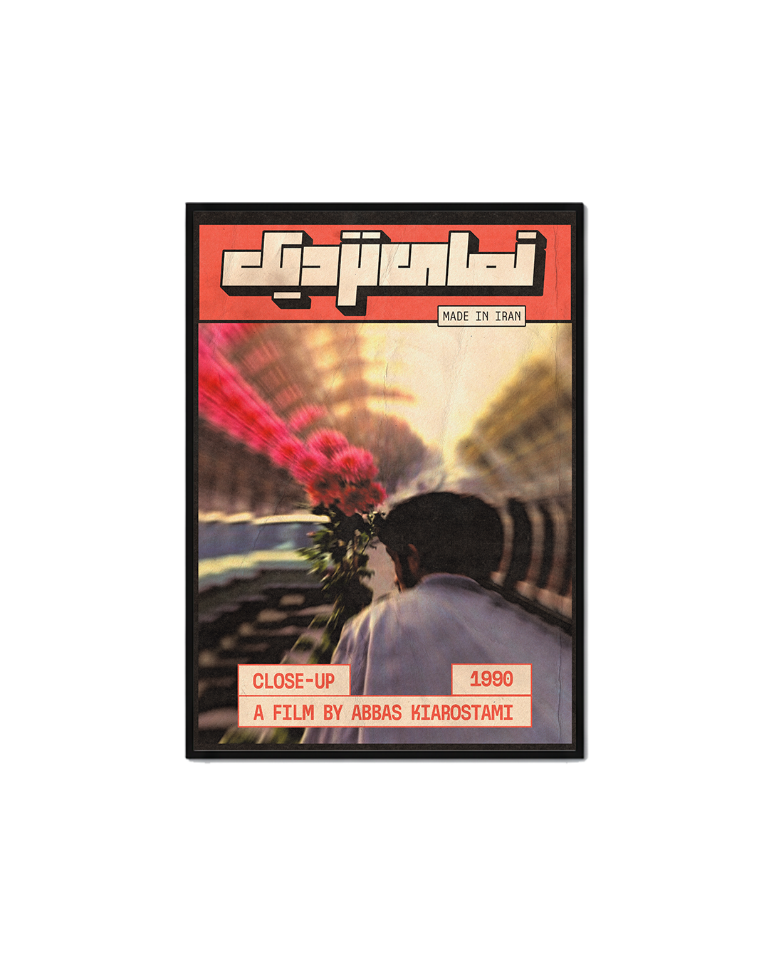 Toward the bottom, the design displays the film’s English title “CLOSE-UP,” the year 1990, and the text “A FILM BY ABBAS KIAROSTAMI.” This simple, print-style layout contributes to the poster’s clean balance and cohesive structure.